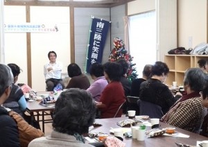 午後は入谷桜沢の復興公営住宅のなかにあるコミュニティセンターでのクリスマス会でした。8月から入居が始まりましたが、もとのようなコミュニティの再生が目下の課題とのことです。隣に座ったお年寄りの女性は、一人暮らしなのでこういう集まりをとても楽しみにしているとのことでした。方言をつないでフランス語のおしゃべりやドイツ語の演説にする高山さんのひとり芝居に会場は盛り上がり、最後に幸せになるおまじない「てっこ(手を)つないで、あばいん(行きましょう)」を、動作を交えて全員で繰り返しました。